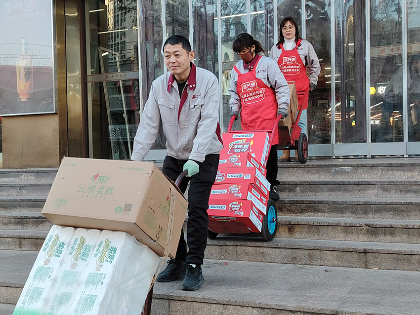 12月31日,民生店同事們齊心協(xié)力,利用開店前時間,裝配團購商品,確保團購業(yè)務(wù)及時配送。
